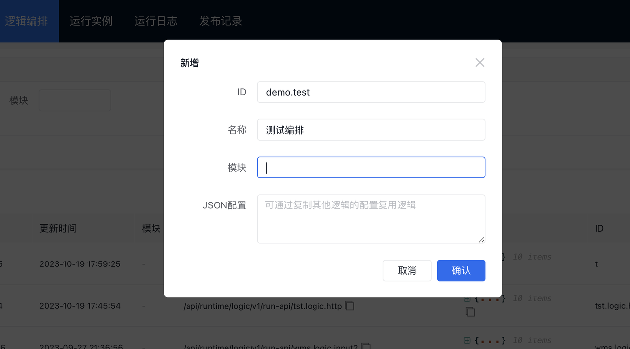 - 点击逻辑编排-[新建],输入唯一标识ID等,确人;